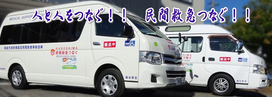 | 鹿児島県霧島市の「民間救急つなぐ」です。霧島市を拠点に鹿児島市、姶良市、伊佐市、曽於市、鹿児島市など近隣の皆様にお気軽にご利用いただけます。 通院・通所・退院・転院はもちろん、ご家族や仲間とご一緒に九州各地の観光やお出かけ、冠婚葬祭など車いす外出にお気軽にご利用ください。ストレッチャーや、長距離にはリクライニング車椅子もご利用いただけます。 |
